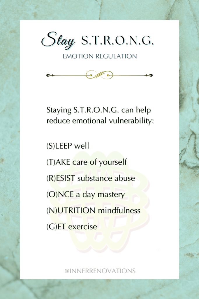 Healthy habits are an important part of managing mood swings, depression, anger, irritability, and other emotions that cause distress. Use the following acronym to Reduce Emotional Vulnerability by remembering to stay S.T.R.O.N.G. Work on these skills, monitor your progress, and master them one by one.